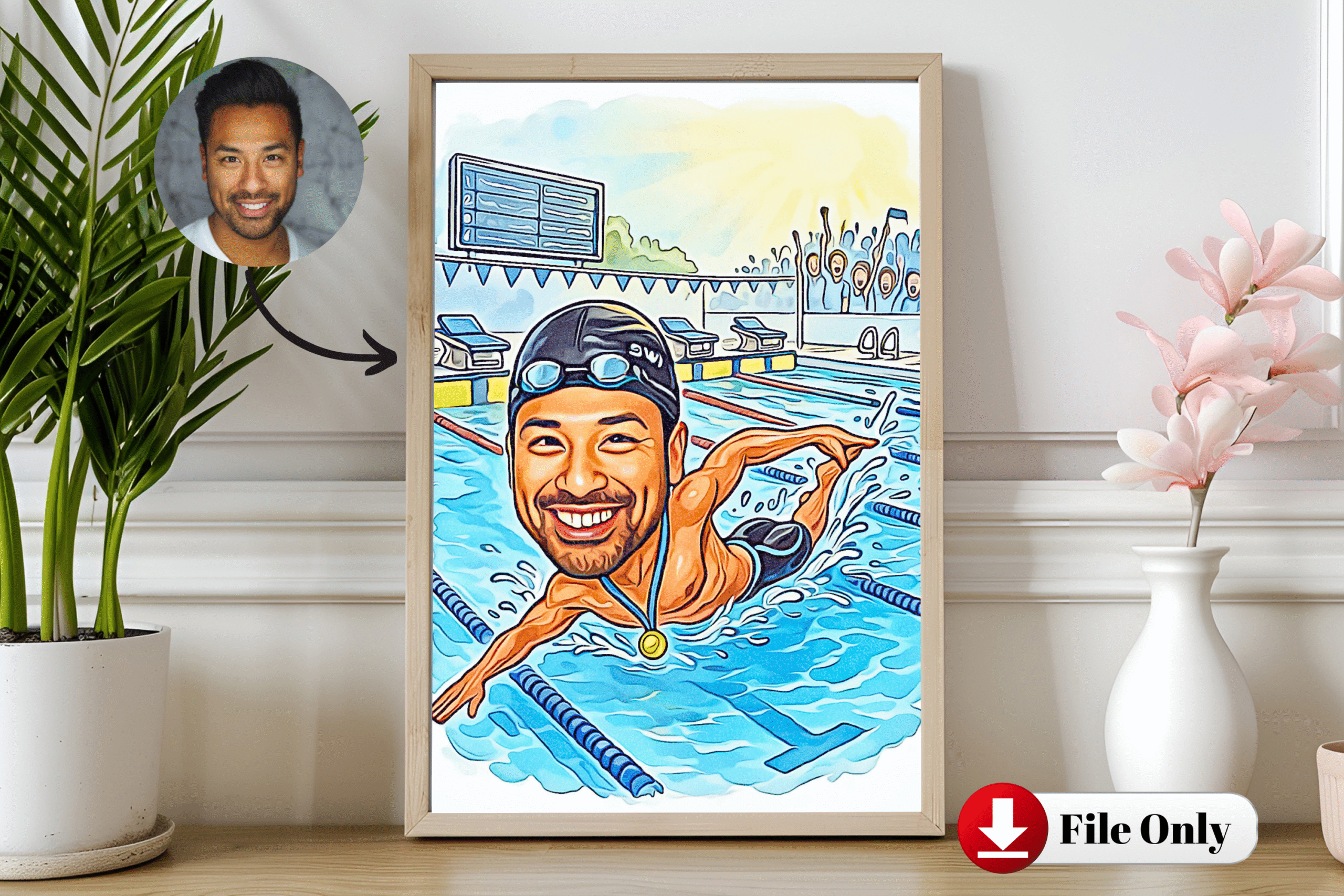 Ordering your custom athletic illustration is incredibly simple. You provide us with a few clear reference photos of the swimmer, and we handle the rest. You can specify the type of stroke, the color of the swim cap and goggles, and even add a gold medal around their neck to celebrate a specific championship win. Every detail of this funny swimming cartoon is tailored to your exact specifications, ensuring the final result is exactly what you envisioned.